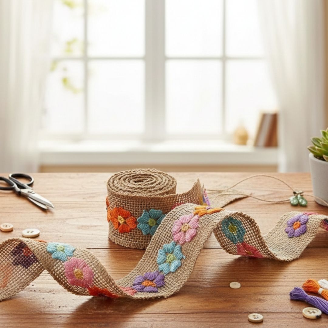 jute lace roll, floral jute ribbon, rustic craft lace, DIY décor accessories, gift wrapping lace, jute craft material, handmade ribbon, embroidery lace, boho craft supplies, B1G1 jute lace.