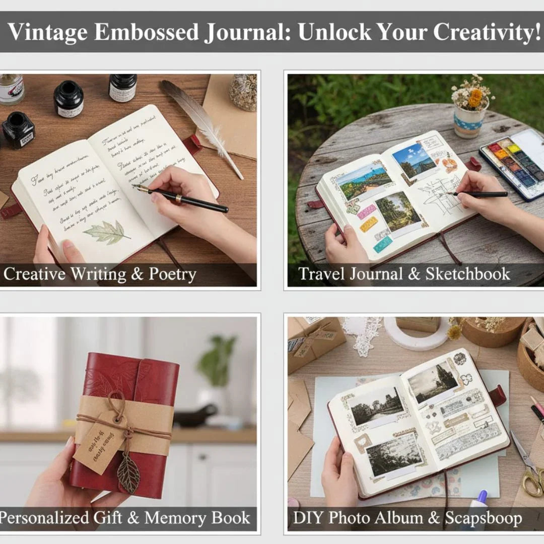 leather journal, vintage diary, aesthetic notebook, personal journal, travel diary, writing notebook, premium stationery, leaf embossed diary, compact pocket journal, cute gift notebook.