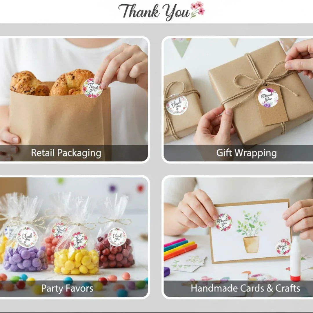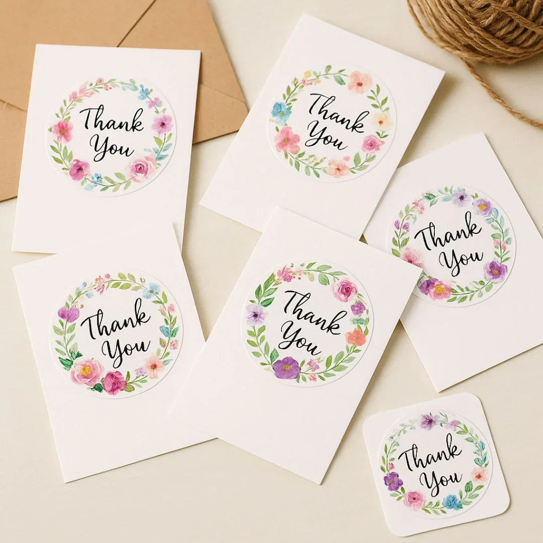 thank you stickers, small business stickers, packaging stickers, floral thank you labels, thank you roll, business branding stickers, envelope seal stickers, gift packaging decor, cute thank you tags, round adhesive labels, seller packaging essentials, aesthetic sticker roll, order packaging supplies.