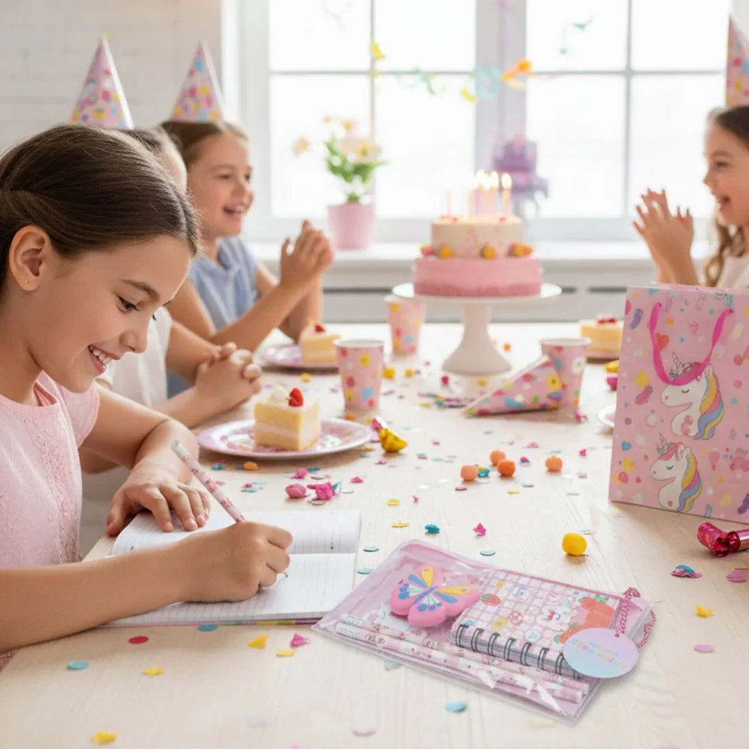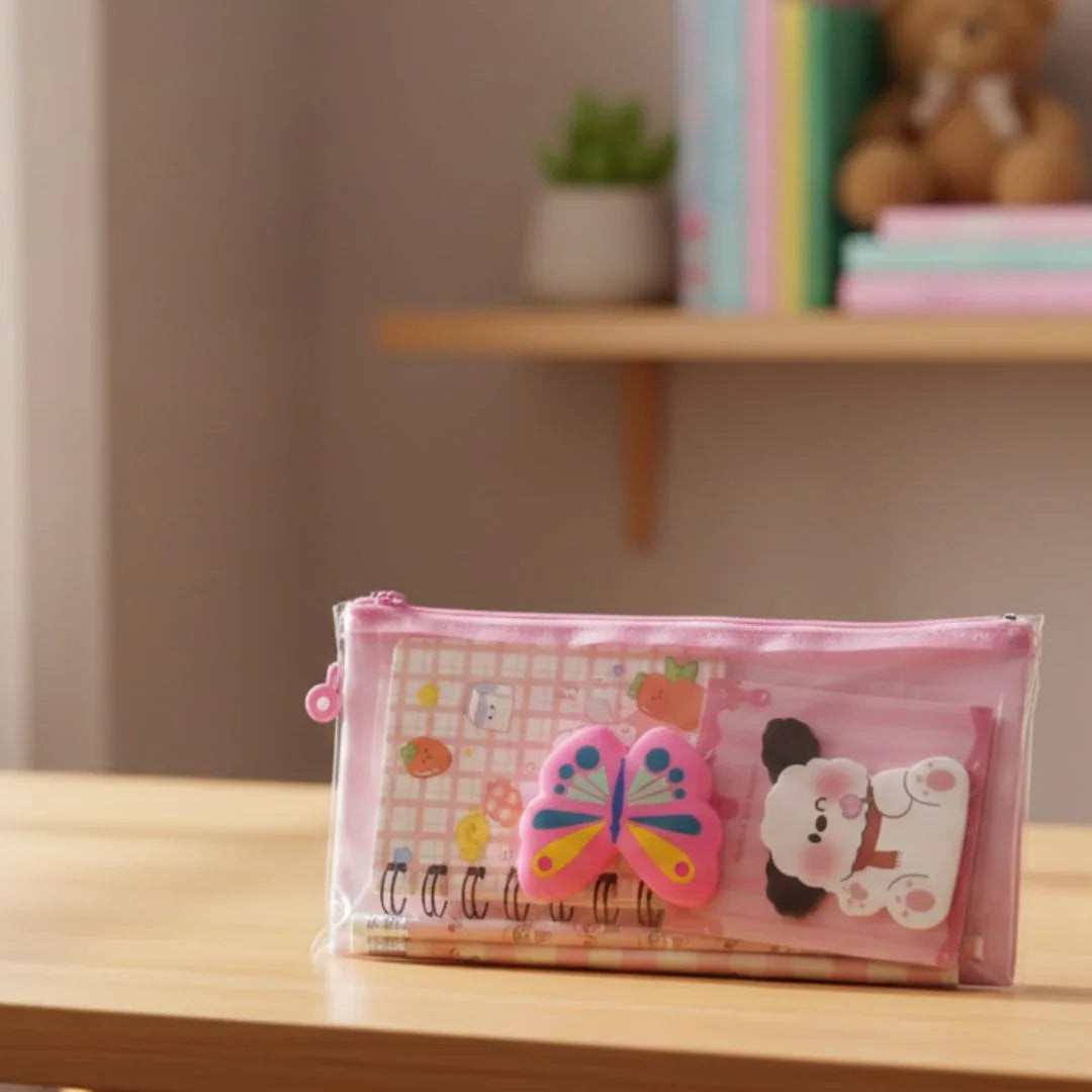 Packed with a mini spiral notebook, pencils, stickers, and a chunky butterfly eraser, it turns everyday study time into a fun aesthetic moment. Perfect for birthdays, return gifts, or just to hype up your kid’s desk setup.